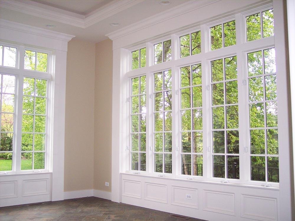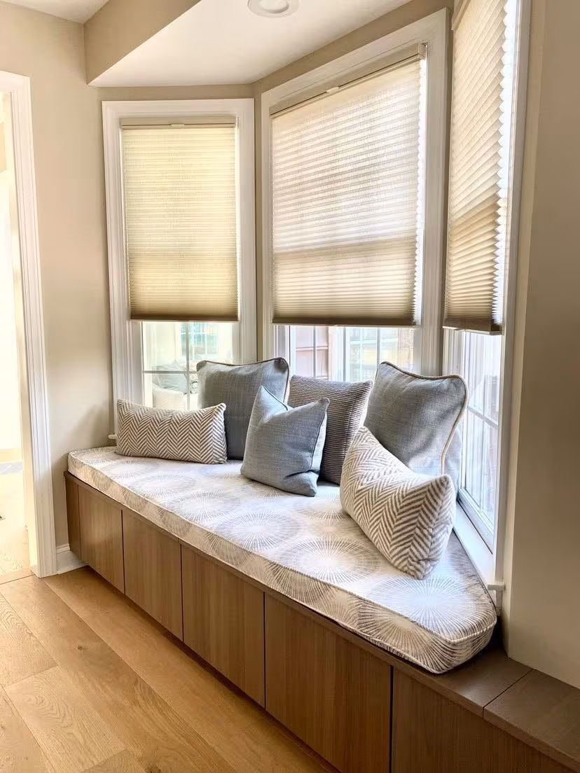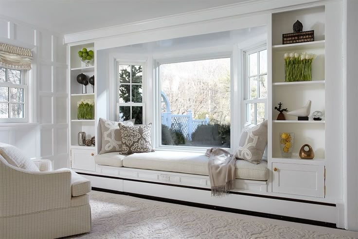 Three-panel bay windows with cushioned seating are ideal for bedroom bay window setups.